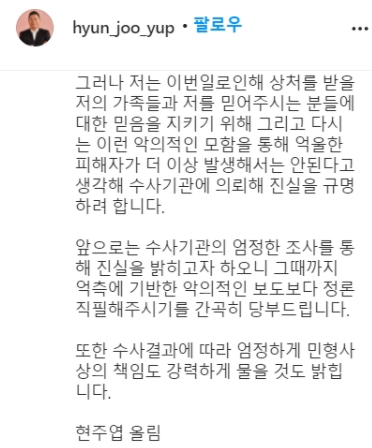 저희들은 현주엽씨의 법률대리인으로서 현주엽씨에 대한 악의적인 제보 내용은 모두 사실이 아님을 법적절차를 통해 명백히 밝힐 것입니다. 또한 결과에 따라 악의적 폭로자와 이에 동조한 자의 행위에 대해 그에 상응하는 중한 처벌을 받도록 최선을 다할 것입니다.