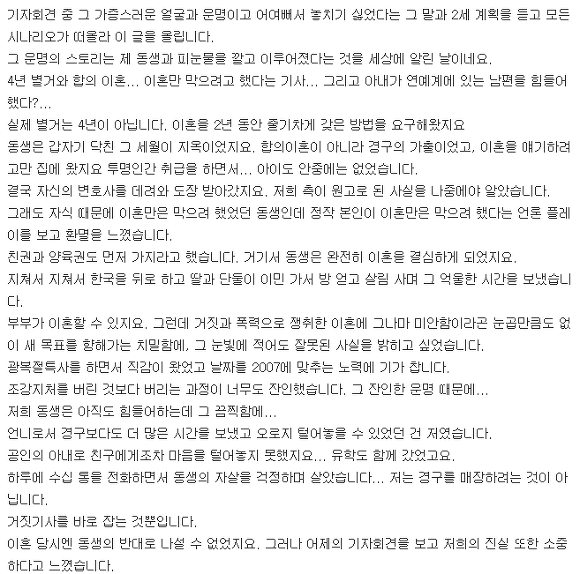 그러다가 2008년 설경구 송윤아가 기자회견을 할 때, 설경구 처형글(설경구 전아내의 언니)이 인터넷에 올라오면서 큰 파문이 일게 됩니다.