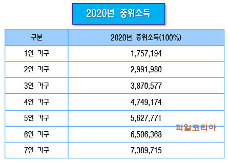 위 표는 2020년 기준 중위소득 100% 기준입니다.