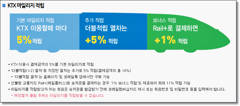 더블적립 열차를 이용할 경우 총 10%가 적립됩니다. 홈페이지와 코레일톡 앱에서만 구입가능하다는 점 참고하시기 바라며 선불형 교통카드 레일플러스로 결제하는 경우 1% 보너스 적립혜택도 주어진다고 합니다. (마일리지를 받으려면 멤버십카드를 제시해야합니다.)