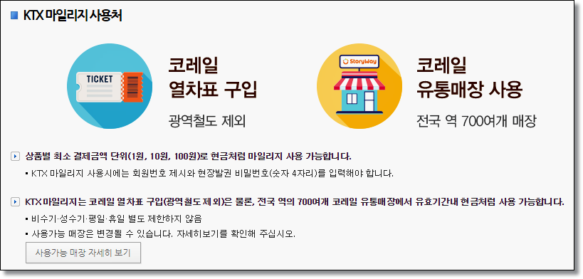 KTX 마일리지로 사용할 수 있는 곳은 코레일 열차표 구입과 전국 역 700여개 매장에서 사용할 수 있습니다. 현금처럼 사용가능하기 때문에 기차 타기 전에 매점에 들려서 음료수나 간식을 사면 좋을 듯 싶습니다.