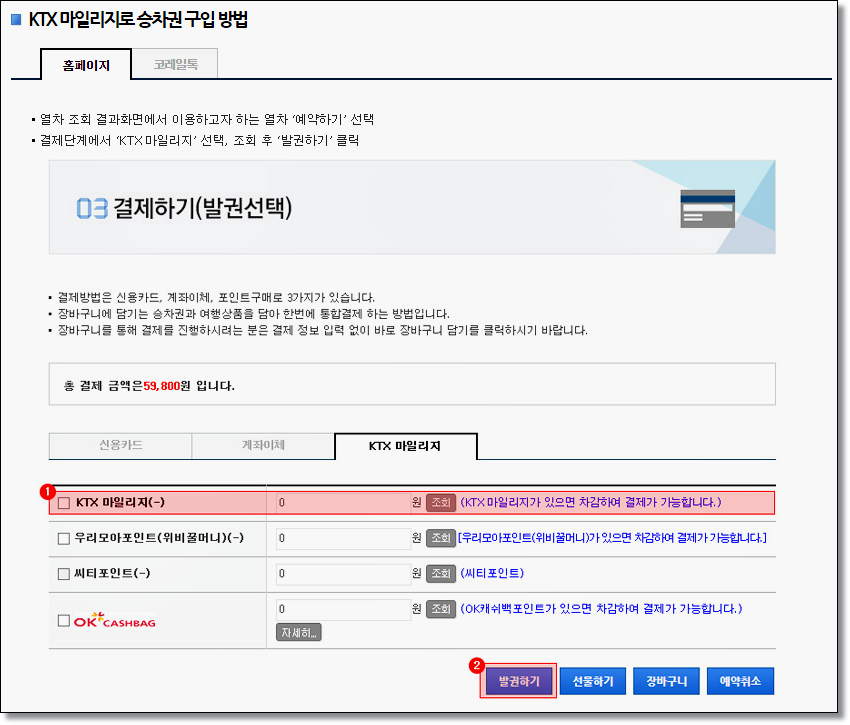 승차권 구입 방법은 위 사진과 같습니다. 결제하기탭으로 넘어갔을 때 KTX 마일리지를 선택 후 금액을 입력한 다음 발권하기버튼을 누르면 완료됩니다.
