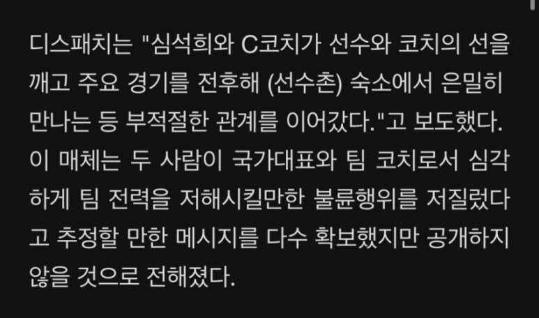 1997년생 한국의 쇼트트랙 국가대표 심석희가 유부남 국가대표 코치와 불륜 관계에 있으며, 다른 국가대표 선수들을 조롱하고, 심지어 승부조작까지 의심스러운 시도를 했다는 충격적인 보도가 디스패치를 통해서 나왔습니다.